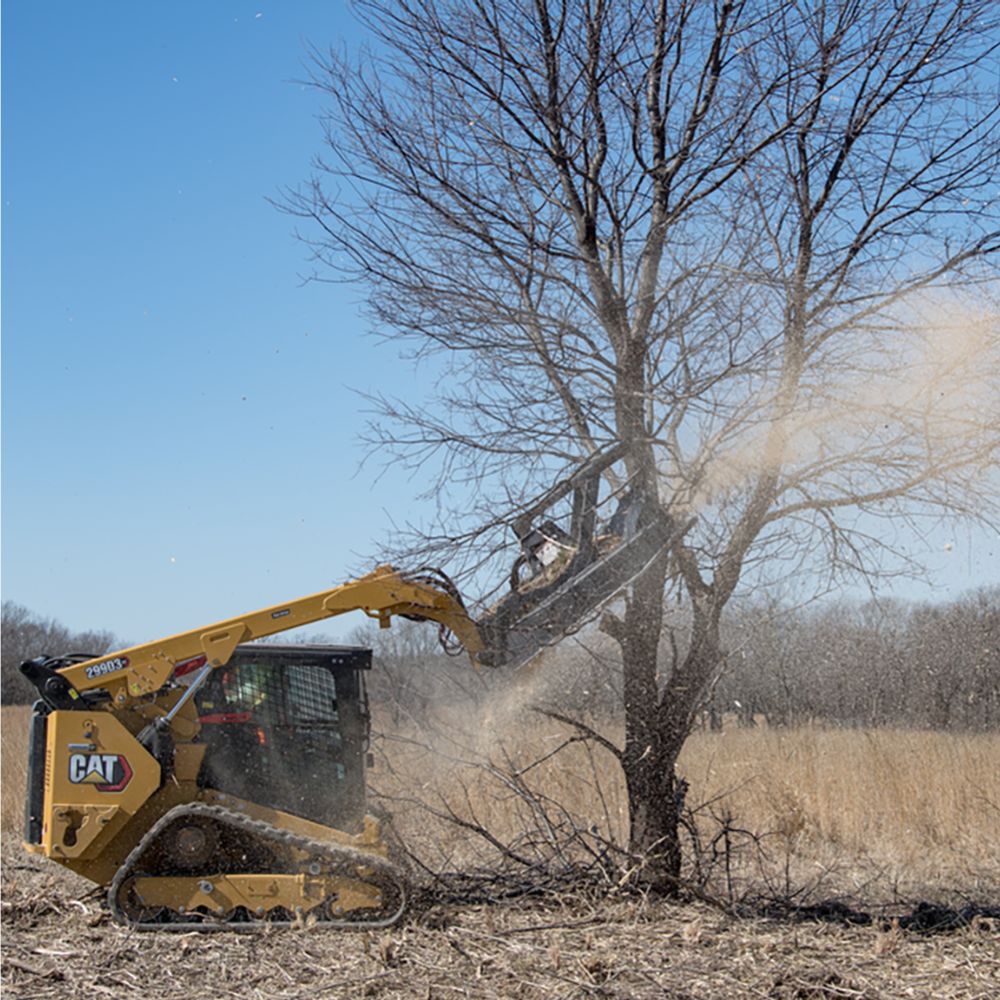 The attachment is ideal for skid steers, capable of felling, mulching, and stump-grinding efficiently. With an ultra-efficient drive system and interchangeable QUADCO teeth, it offers durability and ease of maintenance. Suitable for handling trees up to 14 inches and stumps to grade, it ensures a versatile and powerful forestry solution.