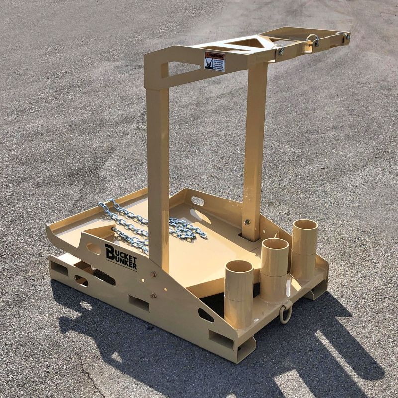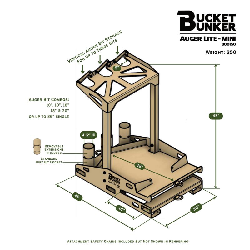 To add to the incredible storage line by Bucket Bunker, we introduce the Auger Lite - Mini made for Mini-Skid attachments! The Auger Lite - Mini is capable of holding 1 hydraulic auger drive and/or breaker, 3 standard length auger bits, 1 mini-skid bucket, and a set of pallet forks; making your storage and transportation easy and efficient.